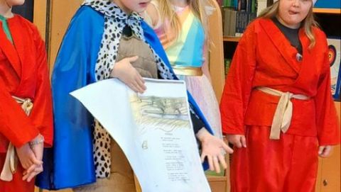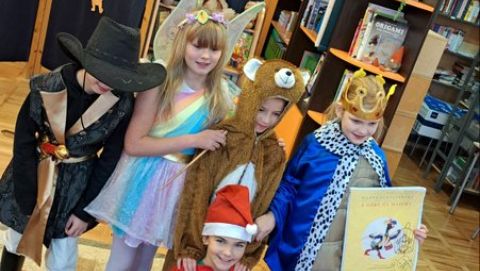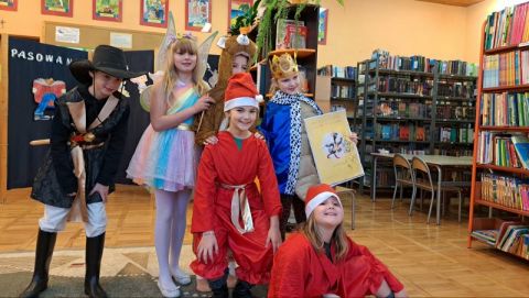 W tym szczególny dniu, w naszej bibliotece odbyło się pasowanie na czytelników uczniów klas pierwszych. Pani Małgorzata Zawadzka wraz z uczniami kl. 3a przygotowała dla najmłodszych czytelników niespodziankę-krótkie bajkowe przedstawienie pt. „Życzenia książki”. Piękne kostiumy, a przede wszystkim wspaniała gra aktorska to przepis na oczarowanie widowni, która nagrodziła artystów gromkimi brawami. Pierwszaki już wiedzą, że czytanie to najlepszy sposób na nudę. Dzięki książkom mogą przenieść się do zupełnie innego świata i przeżyć fantastyczne przygody. Wiedzą, jak należy korzystać