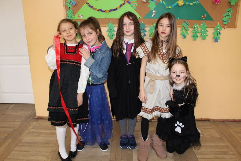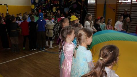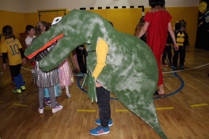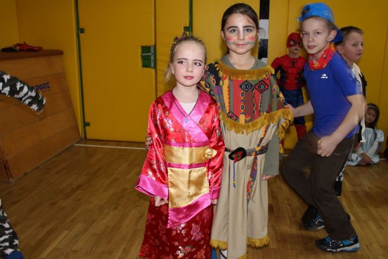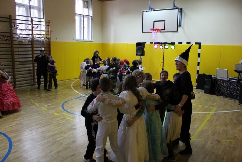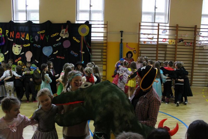Dzisiaj już od rana w szkole pojawiały się kolorowe postacie. Dzieci z klas 1-3 przebrane były za bohaterów znanych bajek, można było spotkać wróżki, królewny, myszki, kotki, rycerzy, piratów, Spider-Mana, Batmana, smoka... nie sposób zliczyć i wymienić wszystkich. Do wspólnej karnawałowej zabawy zaprosił przebierańców niestrudzony wodzirej Pan Tomasz. W sali podczas pląsów zrobiło się bardzo kolorowo, wszyscy świetnie się bawili, uśmiech nie znikał z twarzy mimo zmęczenia.