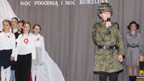 12 listopada uroczysta akademia w naszej szkole była zwieńczeniem świętowania Narodowego Dnia Niepodległości. Słowa księdza Józefa Tischnera „ Jesteśmy Polakami. Tworzymy w sobie naszą polskość. Tworzymy w dzień jasny i dzień ciemny, w noc pogodną i noc burzliwą” stały się mottem historycznego przekazu. Uświadomiły nam, że wszyscy jesteśmy dziećmi tej samej Ojczyzny, której winniśmy dobrze służyć. Wiele było w naszym kraju dni ciemnych i nocy burzliwych. W przedstawieniu słowno-muzycznym koleżanki i koledzy przypomnieli nam te, w trakcie których nasi przodkowie oddali za wolność Polski to, co najcenniejsze- swoje życie. To dzięki ich ofiarności możemy, a nawet powinniśmy w czasie pokoju, w dni jasne i noce pogodne dobrze służyć naszemu krajowi poprzez naukę, pracę, życzliwość i szacunek do innych ludzi.