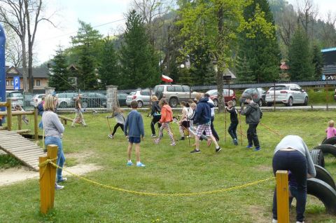 Wszyscy mogli skosztować wyśmienitego jadła góralskiego przygotowanego na tę okazję przez każdą z klas. Potem można było pojeździć na kucykach i osiołku, wdrapać się na ściankę wspinaczkową, wejść do wozu strażackiego i policyjnego, pokonać tor przeszkód na szczudłach, zgłębić tajniki malarstwa na szkle, zasmakować orzeźwiającej lemoniady, lodów i pysznych słodkich wypieków, zjeść coś konkretnego z grilla, osłodzić usta watą cukrową i goframi z bitą śmietaną, zrobić manicure, wyciągnąć szczęśliwy numerek, kupić książkę, nabyć wartościowe dzieło sztuki…Młodsze rodzeństwo w strefie leżakowania mogło budować zamki z piasku i bawić się na placu zabaw. W atmosferze gorących emocji odbył się mecz piłki nożnej pomiędzy drużynami: uczniów, rodziców i nauczycieli. Dla dorosłych zorganizowano szkolny „ honorowy punk krwiodawstwa”. Podczas naszej imprezy odbyły się także pierwsze zajęcia rekreacyjne z nornic walking w ramach Programu 3x30x130 z Rodziną i Bliskimi.