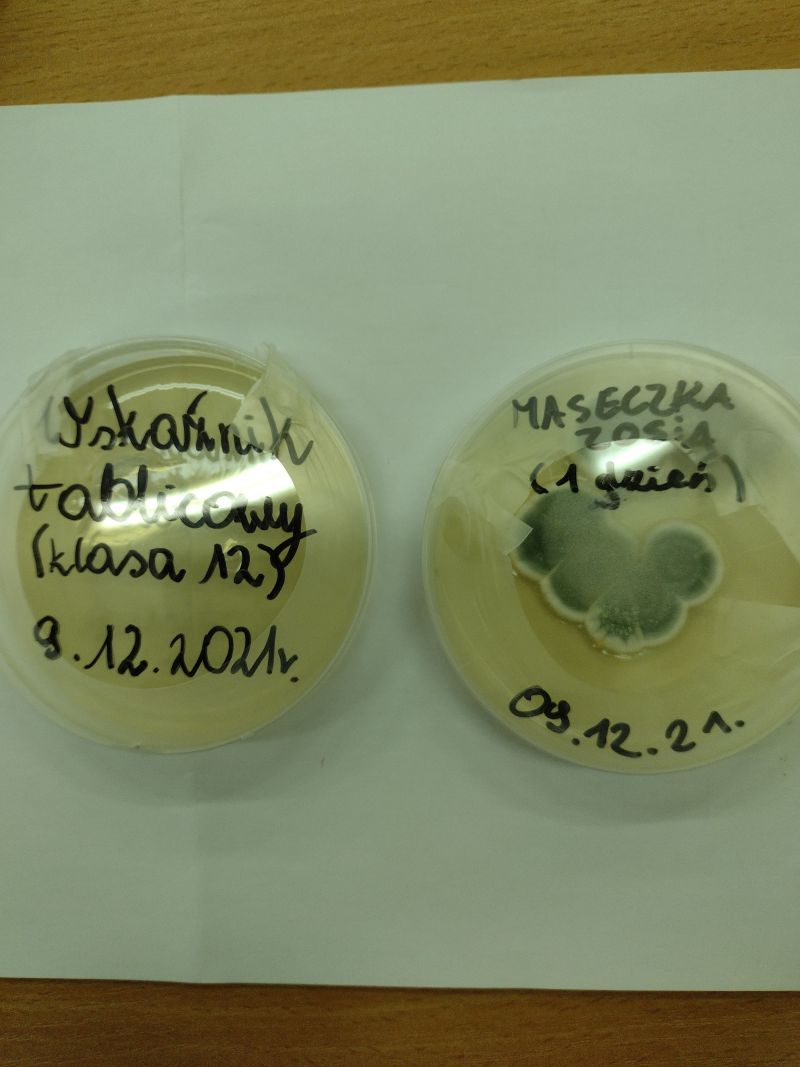 Na dodatkowych zajęciach przyrodniczych uczniowie klasy 5b i 7a sprawdzali jakie "formy życia" występują na przedmiotach codziennego użytku. W specjalnej pożywce mikrobiologicznej uczniowie odciskali dłonie, pieniądze, telefony, maseczki, wskaźnik, a nawet klamkę drzwi do męskiej toalety. Niestety najwięcej drobnoustrojów wyrosło na hodowlach z odciskami telefonów i maseczek. Wniosek uczniów był jednoznaczny: "Należy częściej zmieniać maseczkę, nie kłaść jej byle gdzie i dezynfekować przedmioty, których się używa."
