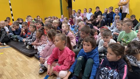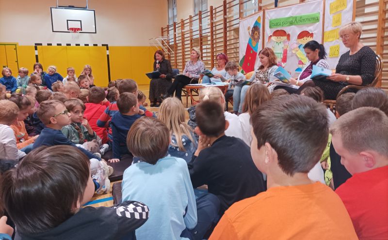 11 października 2023 uczniowie klas 1-3 zostali zaproszeni przez panią bibliotekarkę do sali gimnastycznej, aby świętować Ogólnopolski Dzień Głośnego Czytania. Do wspólnego czytania została wybrana książka pt. „Dzieci pana Astronoma” autorstwa Wandy Chotomskiej. Dzieci usłyszały fragmenty zabawnej historyjki o rodzince pana Astronoma, w której pan domu - roztargniony naukowiec - próbuje dwójce swoich pociech objaśnić wszechświat.W tej opowiastce pojawia się także postać polskiego astronoma Mikołaja Kopernika, który urodził się 550 lat temu w Toruniu i jako pierwszy uczynił Ziemię jedną z planet, a wiec… wprawił w ruch „ wstrzymał Słońce, ruszył Ziemię”.