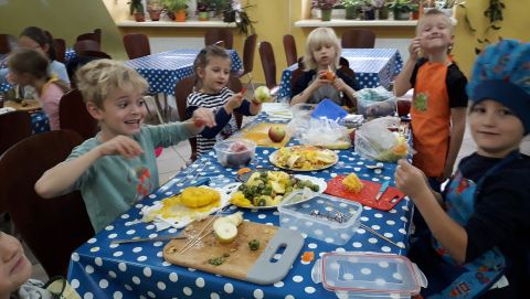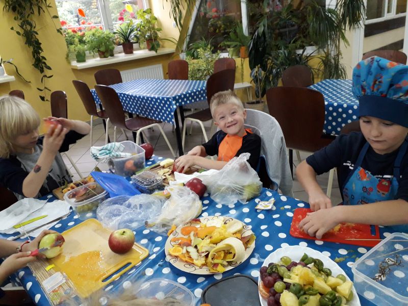 Uczniowie 1a korzystając z obfitości jesiennych darów postanowili urządzić owocowy dzień. Stoły szkolnej stołówki zapełniły się kolorowymi, pachnącymi i różnorodnymi owocami. Były okazy krajowe i egzotyczne. Mycie, obieranie, krojenie - wszystko szło jak należy! Każdy uczeń dzielnie dążył do końcowego efektu, którym był wspaniały, smaczny owocowy „szaszłyk”. Po ciężkiej pracy wszyscy z apetytem konsumowali swoje „dzieło”. Palce lizać, mniam, mniam!