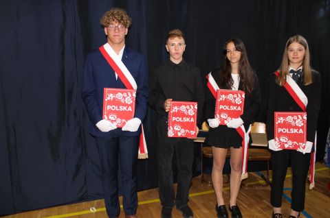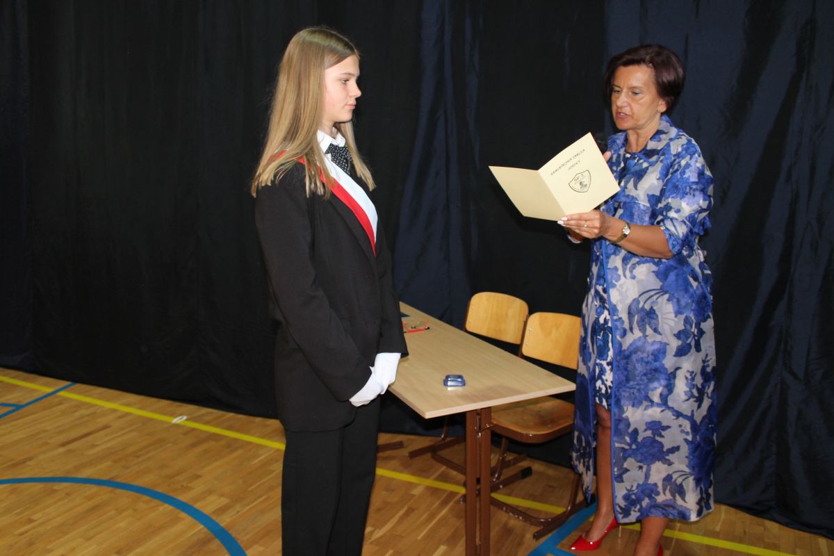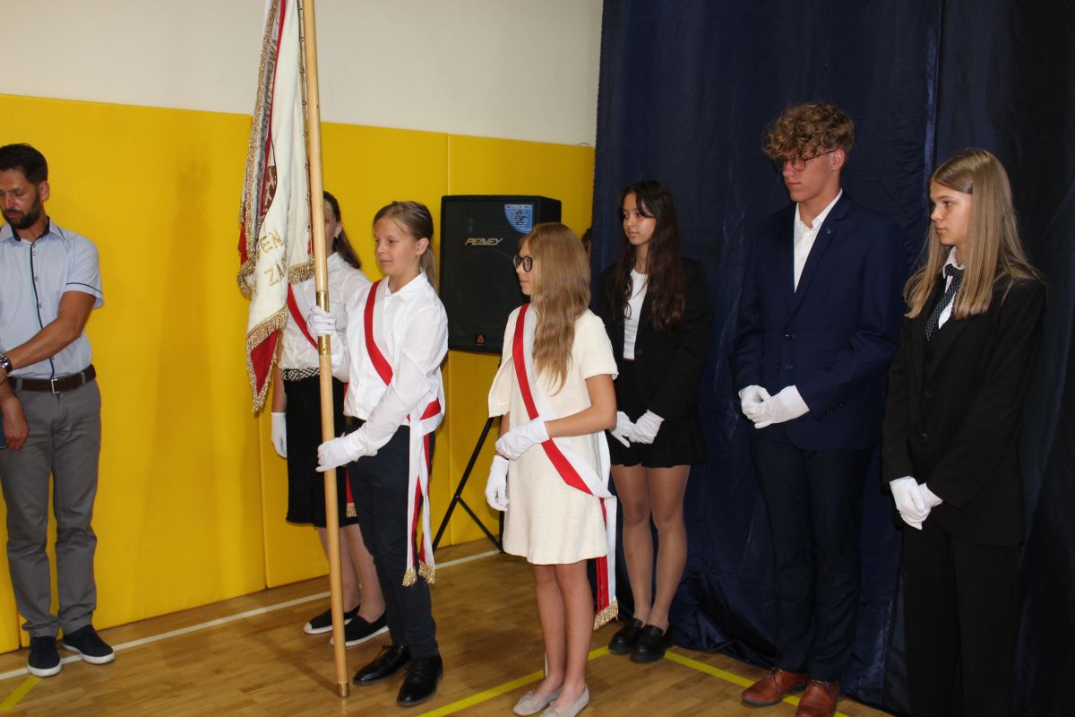 Ważnym punktem uroczystości było ślubowanie uczniów klas ósmych oraz przekazanie przez nich Sztandaru Szkoły młodszym kolegom.