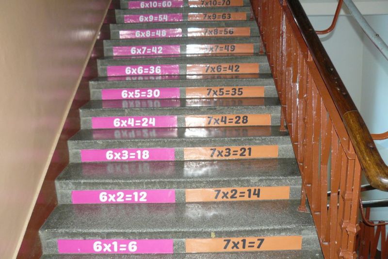 Edukacyjne schody – to oryginalny pomysł w naszej szkole. Każdy stopień to jedno działanie z tabliczki mnożenia- ściąga, która pomaga uczniom w nauce. Każdy krok to szybka powtórka przed sprawdzianem. Zdaniem uczniów takie napisy ożywiły wygląd klatek schodowych, które dotąd były szare i nudne a teraz zyskały zainteresowanie. Nikt nie przechodzi nimi obojętnie i o to chodziło. Wierzymy w to, że edukacyjne schody będą skutecznym sposobem na poprawę szkolnych stopni.