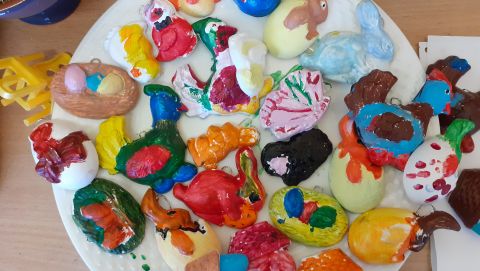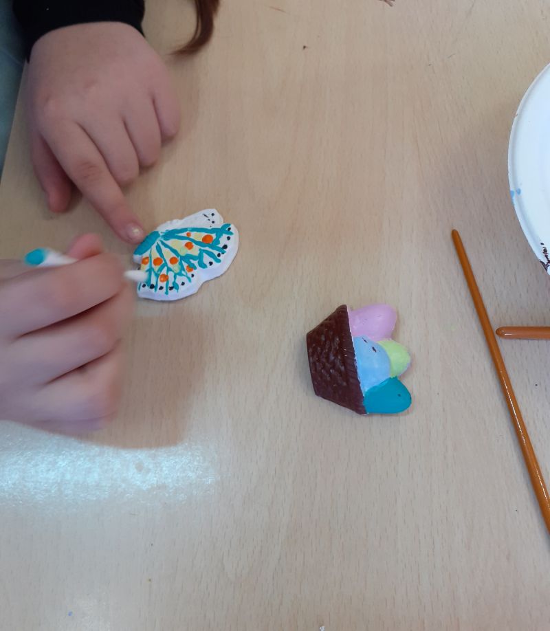 29.03.2023r. uczniowie klasy 1b pod kierunkiem swojej wychowawczyni p. Teresy Skupień oraz p. Kasi Marusarz wykonali piękne dekoracje Wielkanocne jakimi są kolorowe figurki gipsowe. Bardzo dobrze się przy tym bawili !!