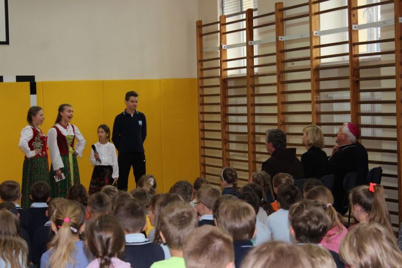 4-go maja mieliśmy zaszczyt spotkać się w szkole z Jego Eminencją Księdzem Biskupem Janem Szkodoniem, który wizytował parafię OO. Bernardynów na Bystrem. Dostojnego Gościa, w imieniu całej społeczności szkolnej, powitała pani dyrektor. Krystian Adamczyk z klasy VIIa, jako przedstawiciel wszystkich uczniów, podziękował księdzu biskupowi za przybycie i poświęcony cenny czas. Powołując się na słowa Mariusza Zaruskiego, naszego patrona „...tylko ćwiczeniem człowiek wznosi się w górę”, zapewnił, że celem każdego ucznia w tej szkole jest zdobywanie wiedzy. Wizyta księdza biskupa przebiegła w bardzo miłej, radosnej atmosferze. To niecodzienne spotkanie uatrakcyjniły „Ogniki radości”, wykonując kilka pogodnych piosenek.
